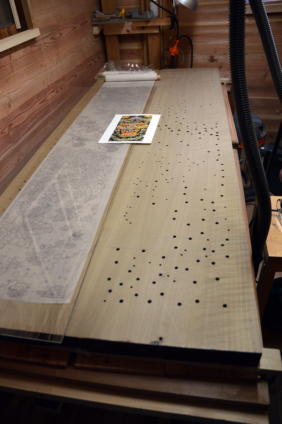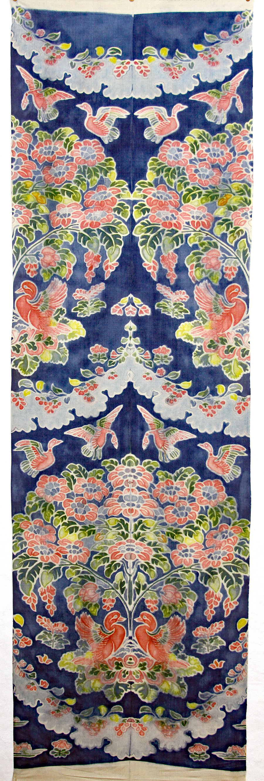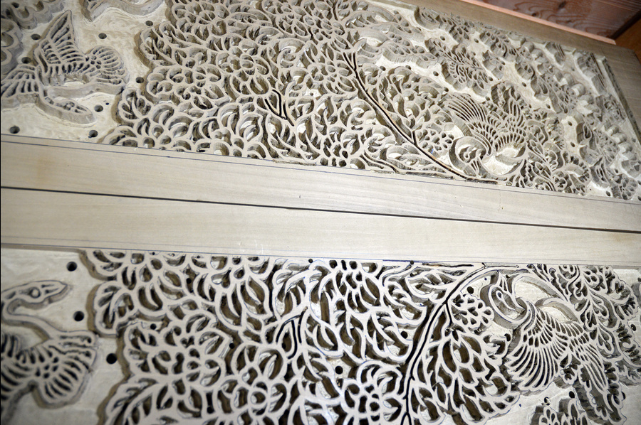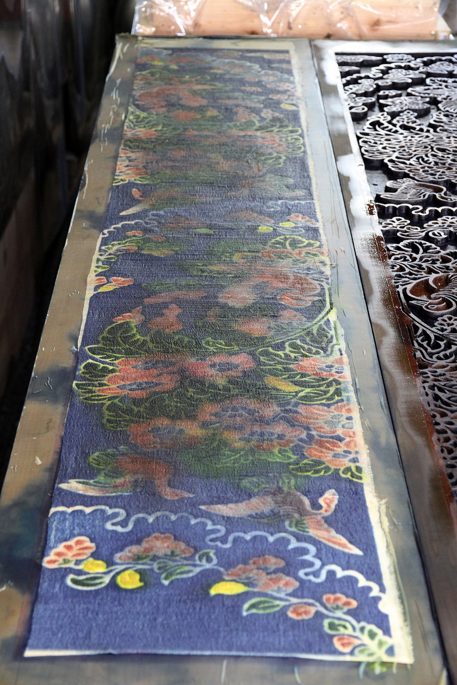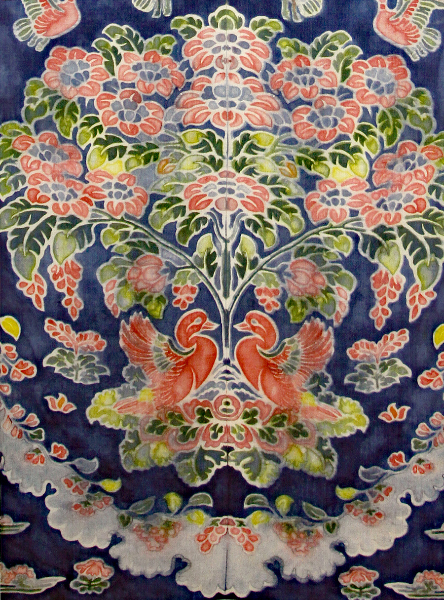 現在、正倉院蔵「紺夾纈絁几褥」(南倉一五〇−一四)に使われている「紺地花樹双鳥文夾纈平絹」の復元作業を行なっています。