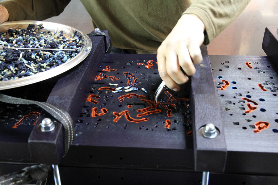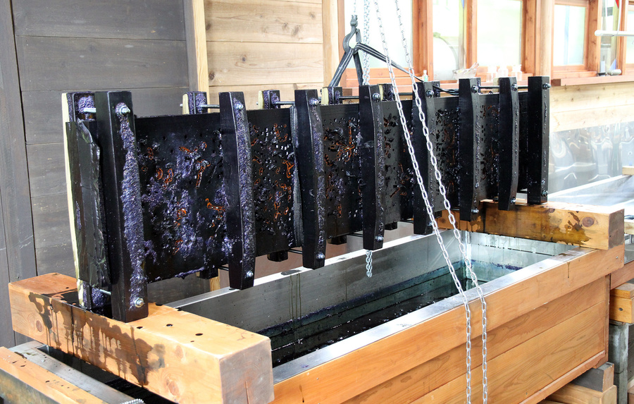 工房では、天然染料と「板締め」の調査研究もおこなっています。