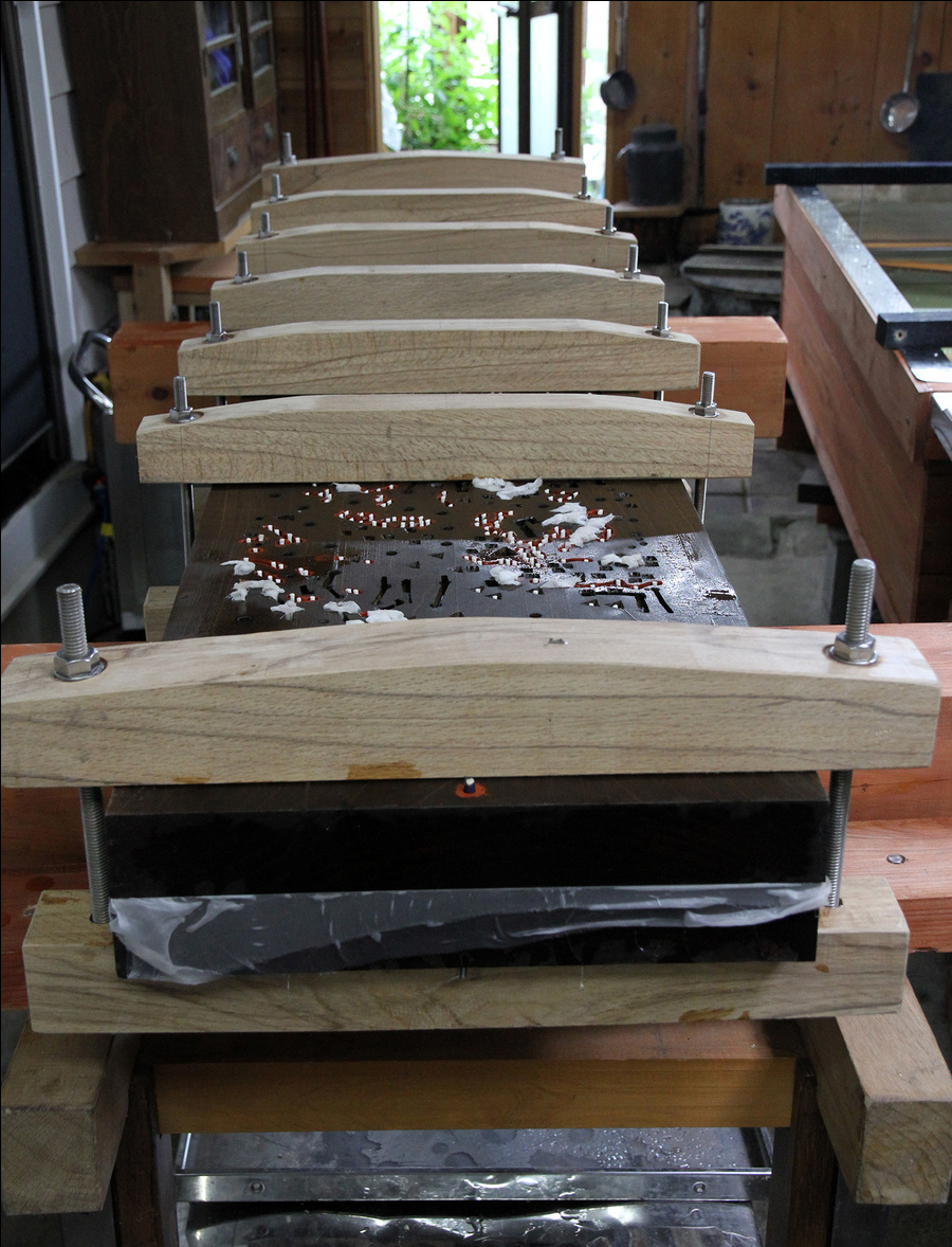 板締め技法は一組の板で布を挟み文様を表す染色技法ですが、布地を幾重にも折り畳み、平らな板で挟んで染める「雪花絞り」などの素朴な「板締め絞り」と、文様を彫った版木で生地を挟んで染める「板締め」に分けられます。後者は、古代の染色技法「夾纈」、江戸時代中期以降に行われた「紅板締め」、「藍板締め」が確認されています。この技法は技術的にも不明な点が多く「幻の染色」とも呼ばれています。