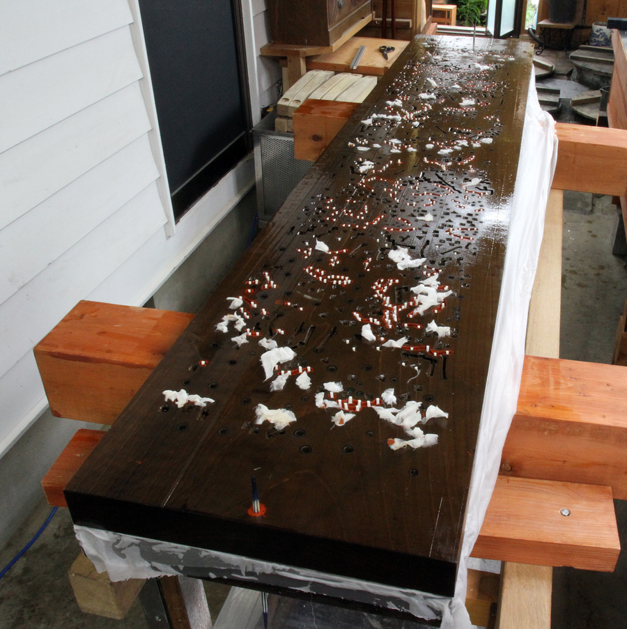 工房では板締めを応用した技法で、藍を主に天然染料で染色作品を制作しています。