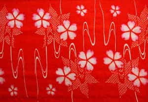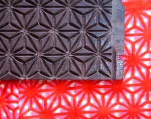 1凸刻版木を用いる地染まり紅板締め(大部分がこの仕上げ) 2凹刻版木を用いる地白紅板締め 両面に文様 |