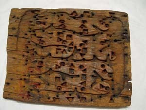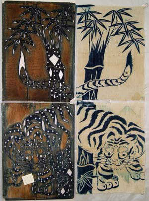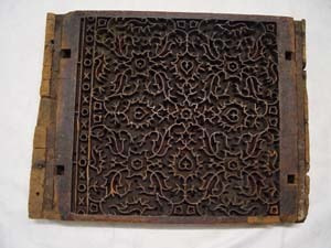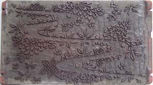 版木の中には、2枚の版木に同じ文様が彫られそれらが鏡像関係になるところから、版木は2枚一組で用いられたと知れる。このバーゼル博物館の版木(図20)は、更紗文様、ボーダーなどの輪郭線は凸状に彫られている。彫られた文様の輪郭線内はそれぞれが独立したエリアを形成していて、文様エリアの内と外にはそれぞれ孔が裏面まで彫り貫かれている。