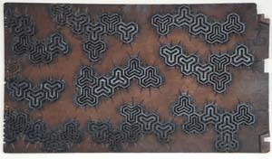- Bタイプ版木:上下版木表面に版木は上下二枚が一組で文様は凹状に彫られ、それぞれが独立していてエリアを形成している。エリアごとに版木表面から裏面に通じる孔が貫通している。(図23)