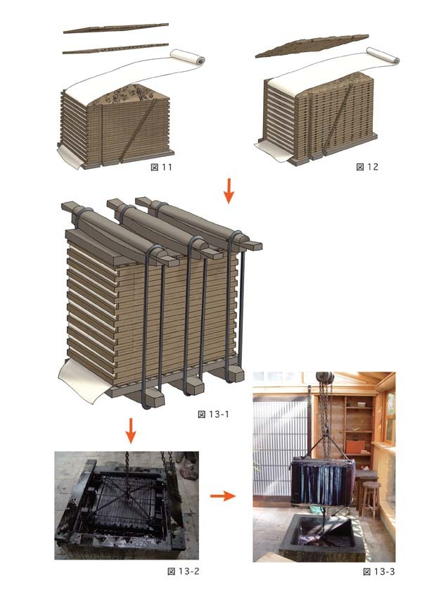 藍の染料は水に不溶で、アルカリ還元溶液に溶解する建染染料に属し、そのため還元、酸化の染色過程を経てはじめて発色、染着する染料である。還元染液で染色した後、酸化を速やかに進める必要があり、生地は折り重ねずに一重で版木に巻き込む(挟み込む)。そのため版木の数量が増え、木綿一反は片面彫り版木四十数枚、両面彫り版木で二十数枚を使って巻き込まれる。一度の染色で一反を染めるが、染色は藍液に浸ける浸染法でおこなわれ、所要の濃度になるまで何度も藍液に浸け染められる。(図13)地白の藍板締めでもその度ごとに還元と酸化が版木内で進行する必要があり、そのための工夫が版木と版木の重ね方にみられる。