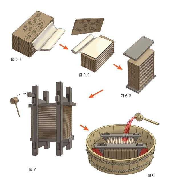 | 巻き上げ | 一重で版木縦方向に巻き上げ | 布を版木縦方向に2つに折りし横方向に巻き上げ | 幾重にも折畳み版木横方向に巻き上げ |