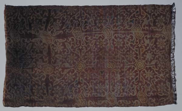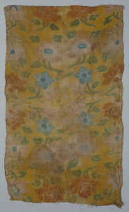 藍板締めは江戸末期で生産を終了し、紅板締めは江戸中期にはじまり大正末までおこなわれた。(注3)この間に天然染料から合成染料への転換が急速に進められた。明治10年代に紅板締めで使う染料は紅花から合成染料(酸性染料、塩基性染料、直接染料)へとほぼ転換している。さらに、板締めには単色染と二色や三色、それ以上の多色に染める多色染がある。近世以降の板締めは単色の板締めであり、華やかで多彩な染の板締めとして知られる古代の板締め・夾纈裂にはいずれの染め上がりの裂も確認できる。板締めは文様を白く残し地色を染める「地染」と文様を染めて地色を防染する「地白」の板締めにわけられる。染料の転換、単色染と多色染、さらに「地染まり」と「地白」の点に留意し考察を進める。