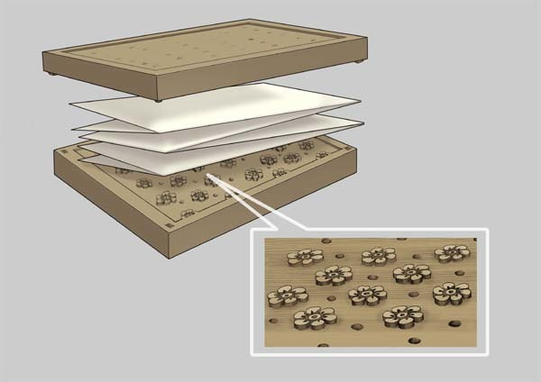 この構造は上下の版木を合わせ締めると、版木凹部に隙間が生じ小さな染色槽になる。