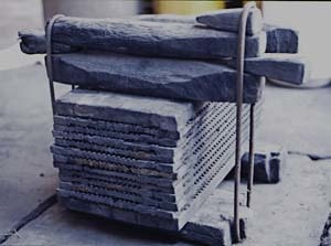 出雲藍板締めの版木は姫小松(五葉松)で作られ片面彫り版木と両面彫り版木があり、そのうち片面彫り版木がおよそ9割合を占める。(図10)片面彫り版木は地白の板締めで両面彫り版木は地染まりの版木である。両面彫り版木は両面に凸状に文様が彫られ紅板締めの版木と大差がみられない。しかし片面彫り版木は文様が凹状に彫られ、文様内から裏面に通じる孔が貫通している。裏面はその孔と通じる溝が並行に彫られている。(注4)版木を積み重ねるガイドとして、版木側面には直角と斜めに溝が2箇所印されている。直角の溝は同位置、斜めの溝はすべて異なる位置にある。この溝をたよりに版木を重ねると、直角の溝は垂直に直線をなし、斜め溝も版木一枚一枚の溝がつながって斜めに連続する。