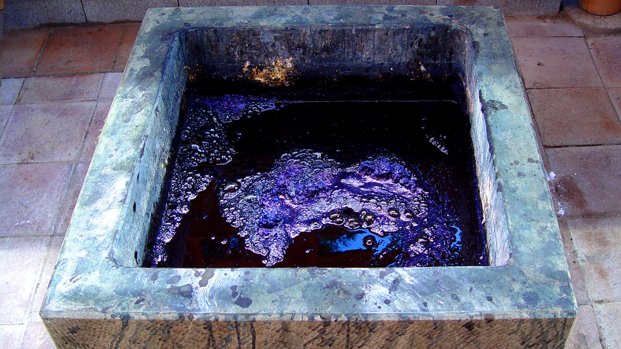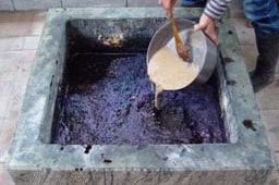 藍の染料として[すくも]を用います。「すくも」はタデ科の蓼藍の葉を幾つもの工程を経て発酵させたものです。「すくも」の染料分はそのままでは水に溶けません。アルカリ性の還元溶液に溶解します。この水に不溶の染料分を水に溶けるようにすることを「建てる」と呼びます。藍を建てるために助剤を使いますが、化学的なものは用いずに昔からのものを用います。[すくも]水溶性にするためのアルカリ剤として木灰汁、石灰を用い、還元には「すくも」に自然に付着している微生物を利用します。微生物が増殖し、活性化することで、染液は還元状態になります。昔から日本各地で行われてきた藍建ての方法です。