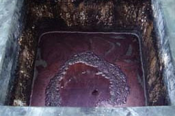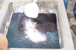 泡(藍の華)がある程度でてきたら、液温位の木灰汁を瓶の4分3まで足し、嵩上げします。発酵が進みますと、急激にアルカリ性が下がりますので、石灰400グラム(中石)投入します。