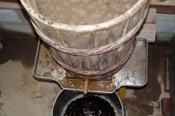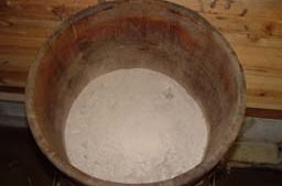 木灰20キロに、熱湯を樽一杯に注ぎ入れ、一日かけて灰汁をとります